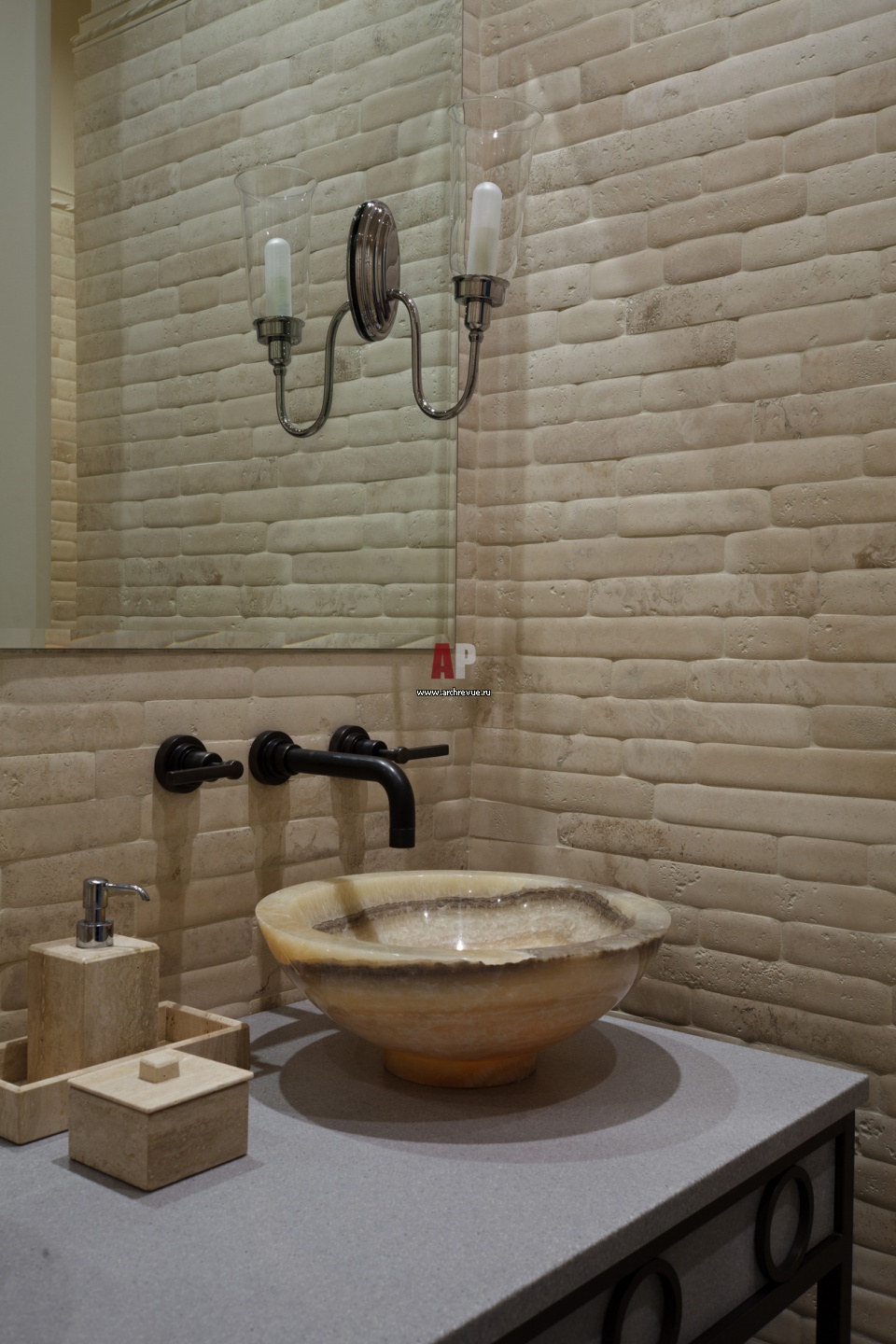 Фрагмент интерьера санузла. Стены облицована плиткой, имитирующей крашеный кирпич.
