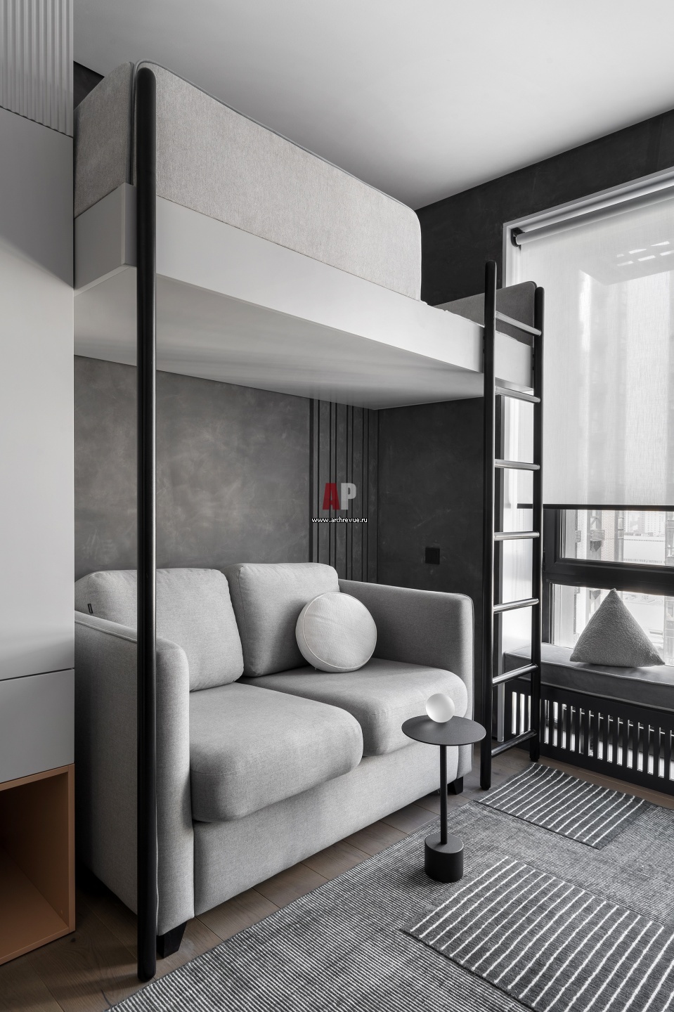 Детская. Двухэтажная кровать на тонких опорах изготовлена на заказ по эскизам дизайнеров. Диван, SK Design.