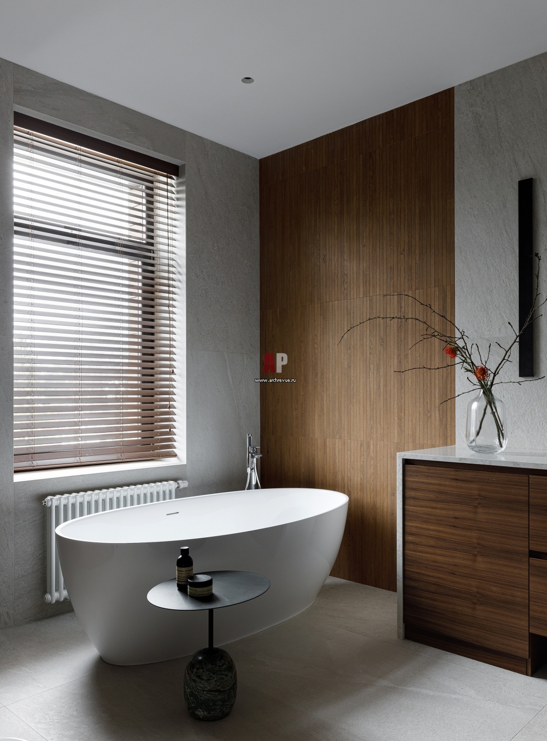 Мастер-санузел. У окна установлена отдельностоящая ванна, в которой можно расслабляться с видом на сад.