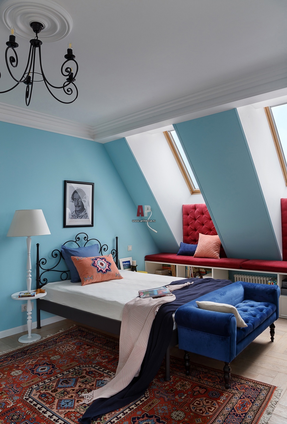 Спальня для дочери-балерины с мансардными окнами. Цветовую гамму с красными, синими и голубыми оттенками она выбрала сама. Под окнами обустроен мягкий уголок- библиотека, где удобно устроиться для чтения любимой книги. Кровать, Cantori. Светильники, на заказ, по эскизам автора проекта.