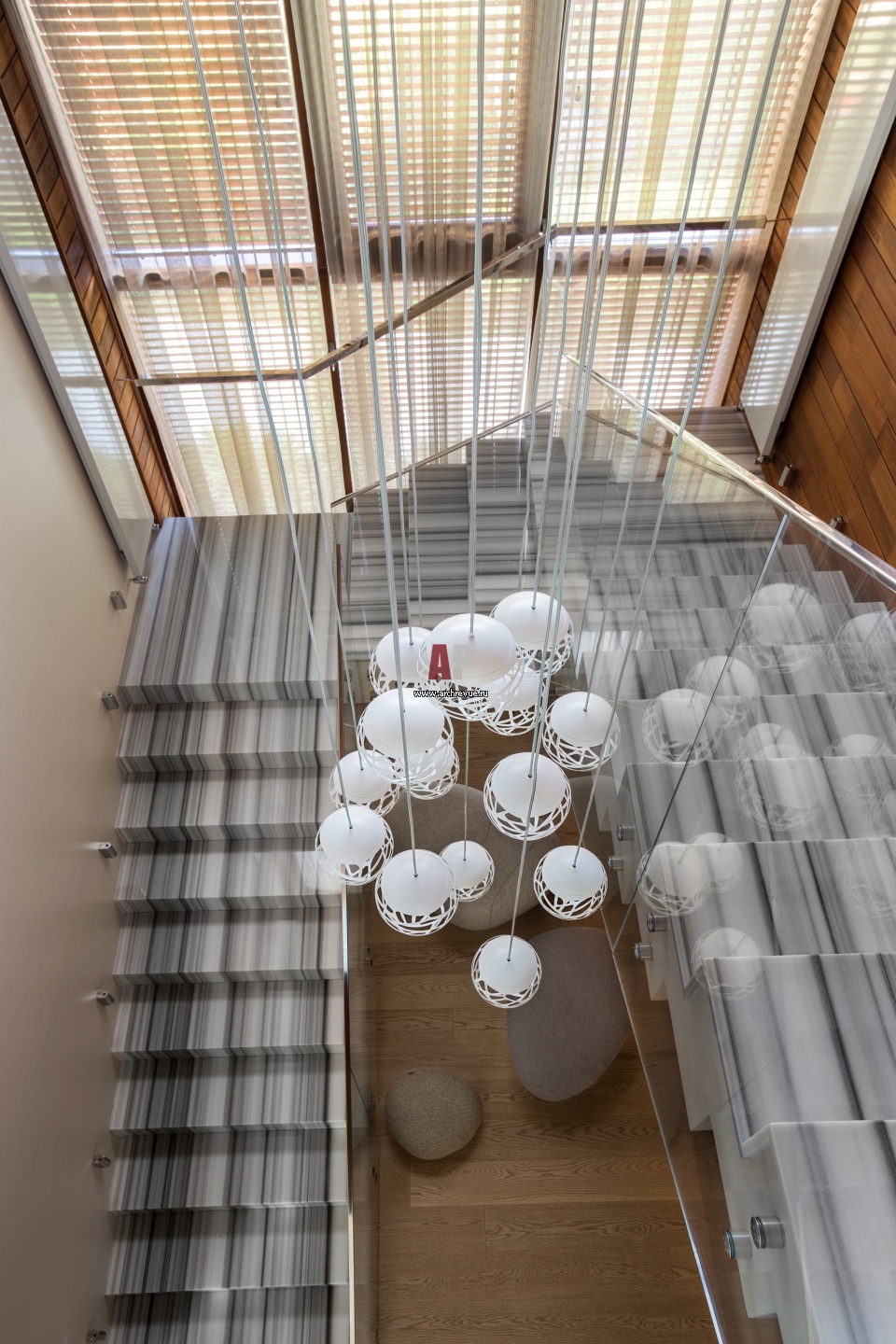 Дом на Волге с природными мотивами. Лестница примыкает к панорамному окну и обращена на окружающий пейзаж. Подвесной светильник Studio Italia Design был доработан под проект.
