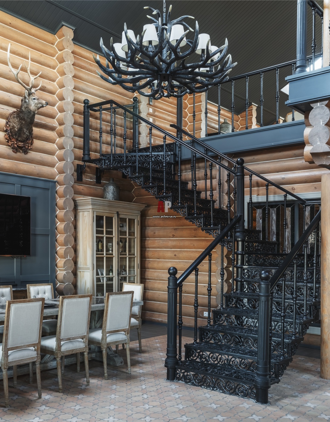 Гостиная в коттедже класса Люкс. Два этажа объединяет черная лестница с ажурным кованым ограждением.