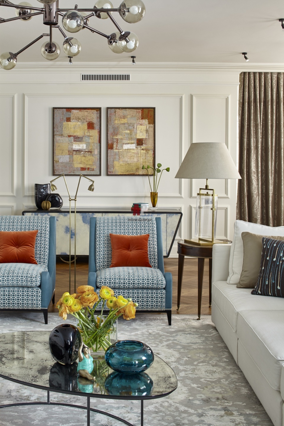 Мягкая зона в гостиной. Диваны The Sofa & Chair Company и Morgan. Кресла, Amy Somerville. Журнальный столик, Ochre. Приставной столик, Julian Chichester. Над комодом Mitchell Gold + Bob Williams –абстрактные картины художника Ольги Шагиной.