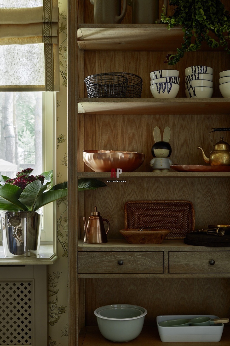 Трехэтажный дом с колониальными мотивами. Интерьер кухни. Римская штора, лен с шелком. Столовое серебро, Christofle. Посуда, Comte Elisee.
