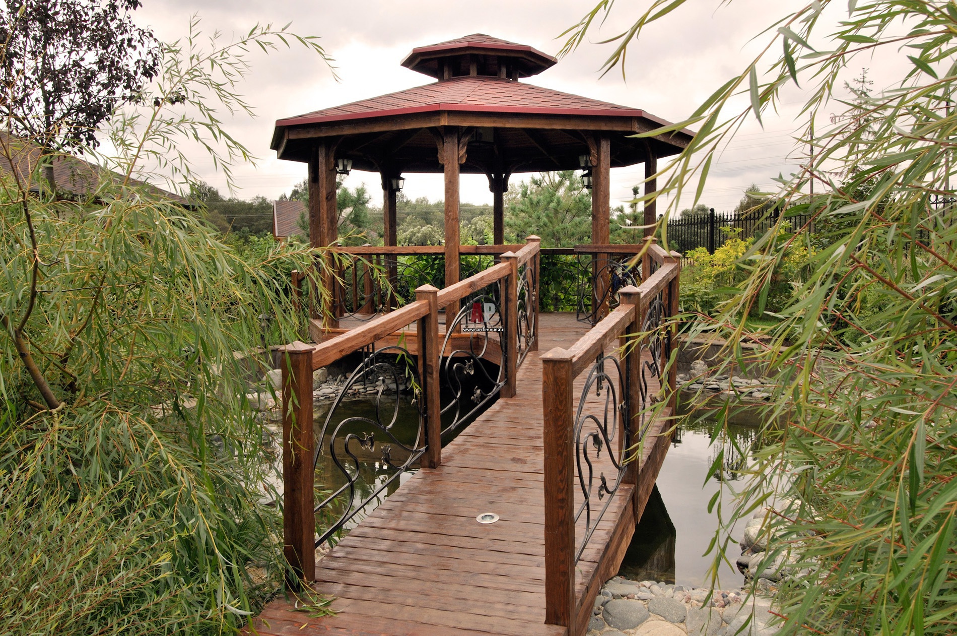 Беседка построена по эскизам архитекторов над водоемом овальной формы. Она выполнена в восточном стиле.