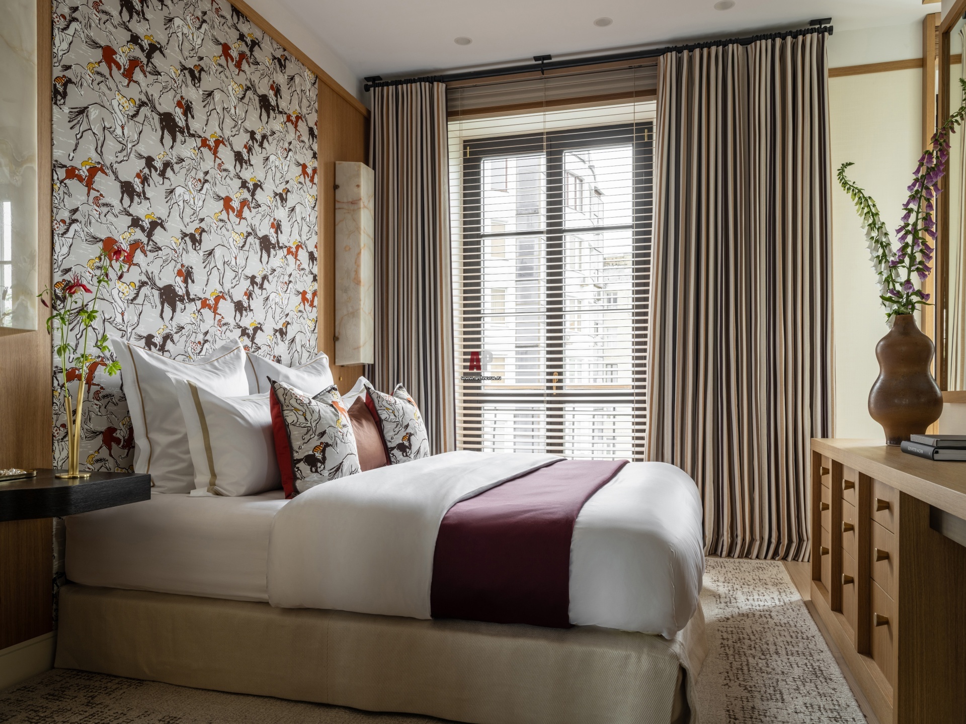 Акцент хозяйской спальни – мягкое изголовье кровати в ткани Hermes. Традиционные орнаменты модного французского дома с наездниками, лошадьми и деталями упряжи, придают выразительности и торжественности, благодаря своей графичности и сочным ягодным и винным оттенкам.