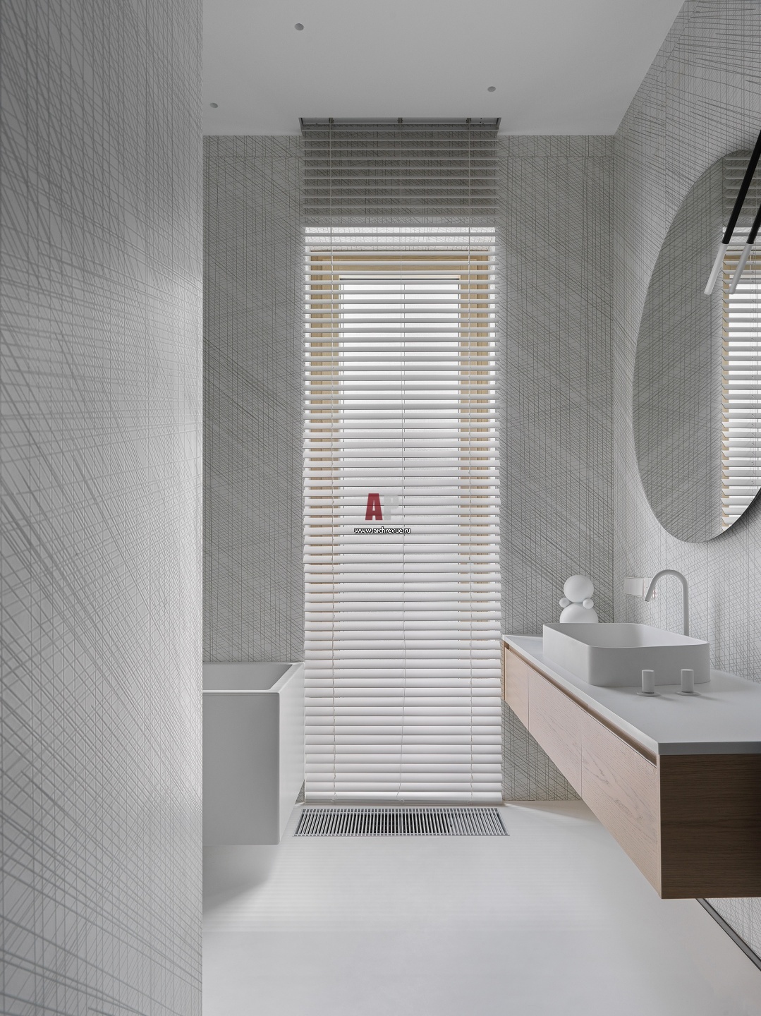 Детский санузел с окном. Стены облицованы керамогранитом с геометрическим рисунком, Lea Ceramiche. На окна – деревянные жалюзи.