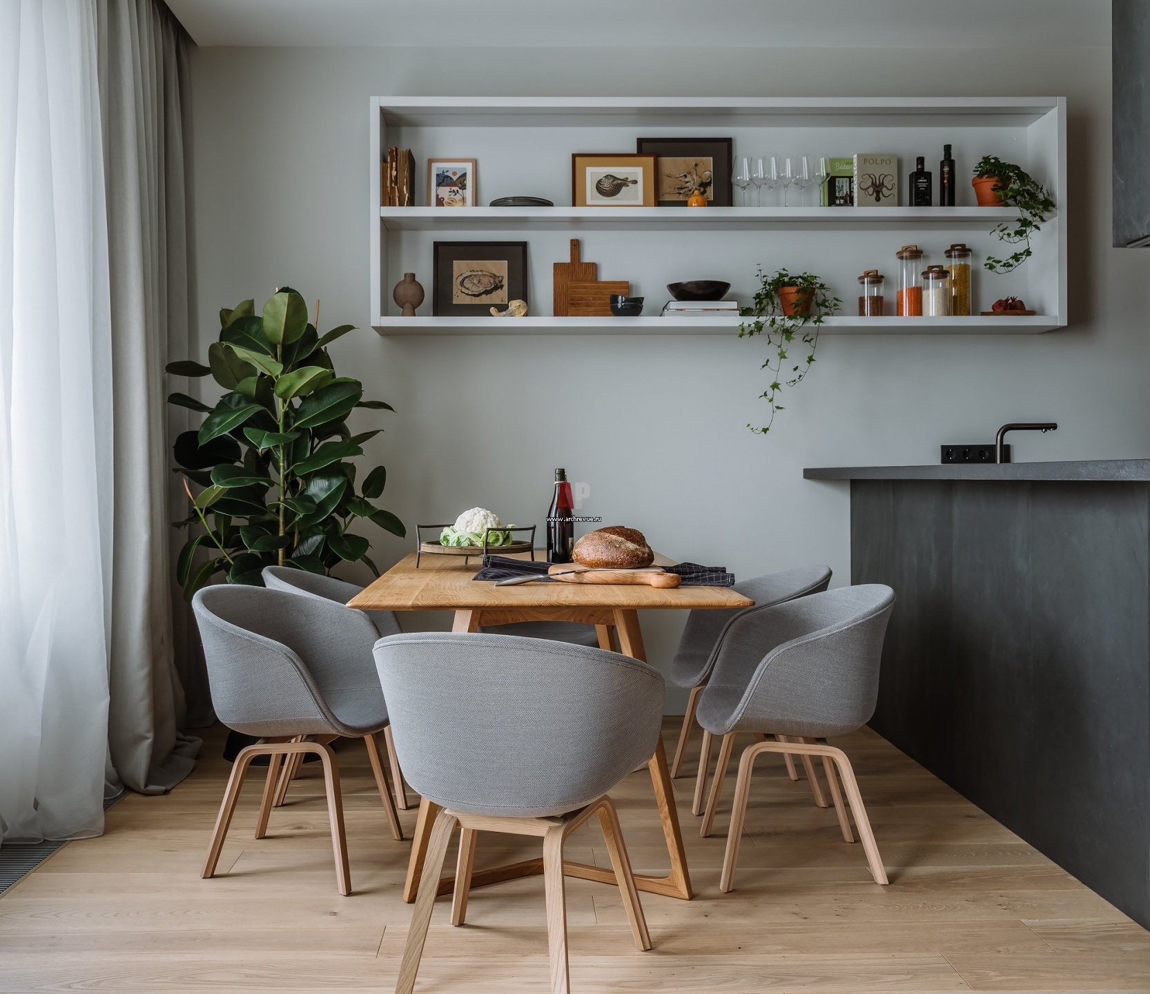 Зона столовой. Обеденный стол, Zeitraum. Стулья, Hay. Графика, Елизавета Бородинова.
