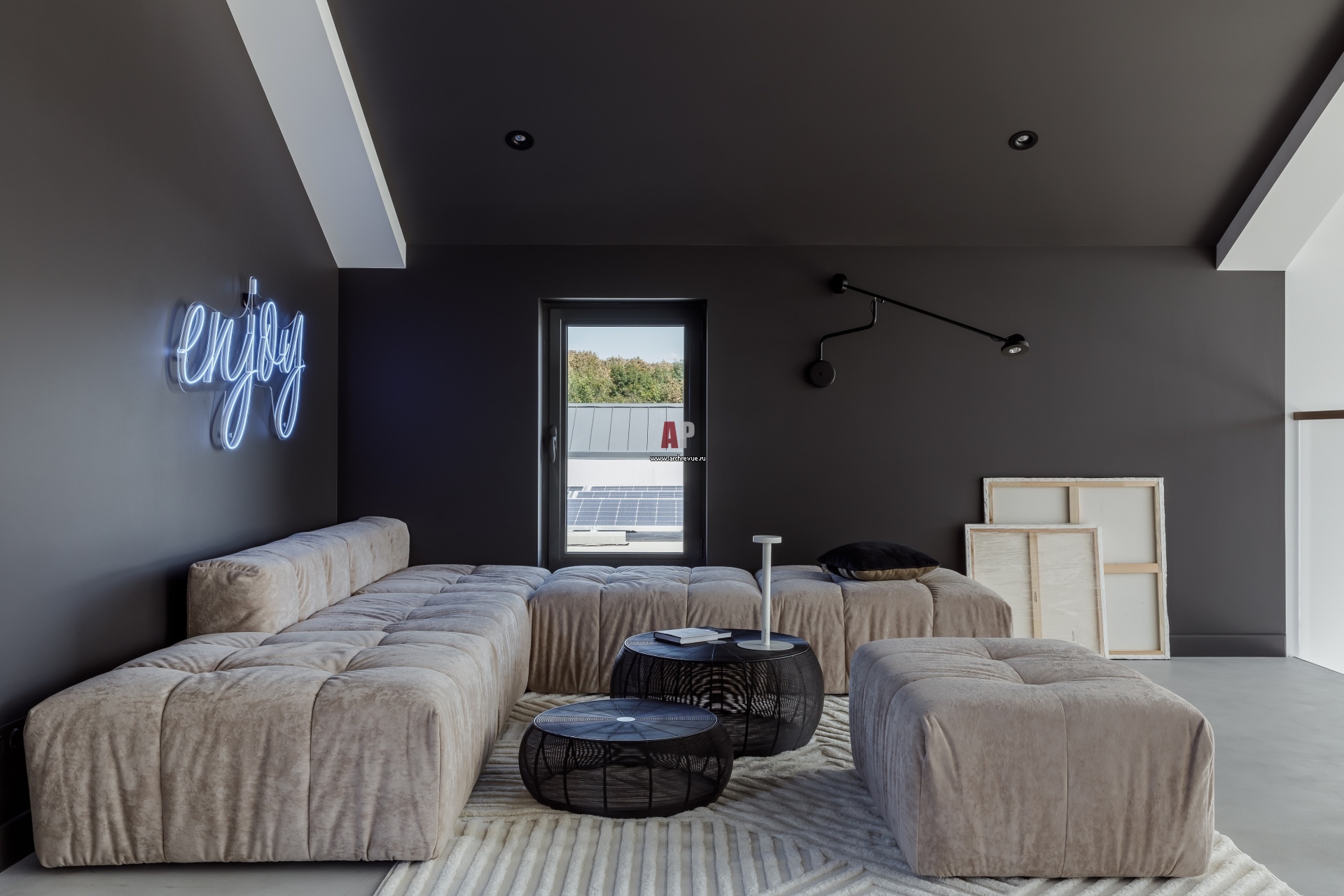 Зона отдыха в мансарде родительского блока. Второй свет выкрашен в черный цвет, краска Little Greenе. Этот прием создает четкий графичный контур и подчеркивает архитектуру