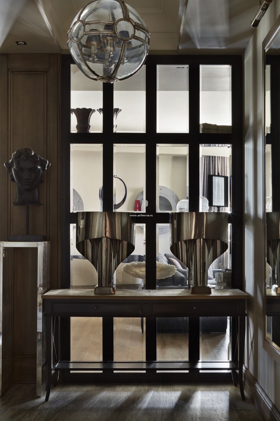 Интерьер респектабельной квартиры в морском стиле. Свет в прихожую проникает из гостиной через стационарную витражную перегородку с витражами из стекла. Мебель, Eichholtz.