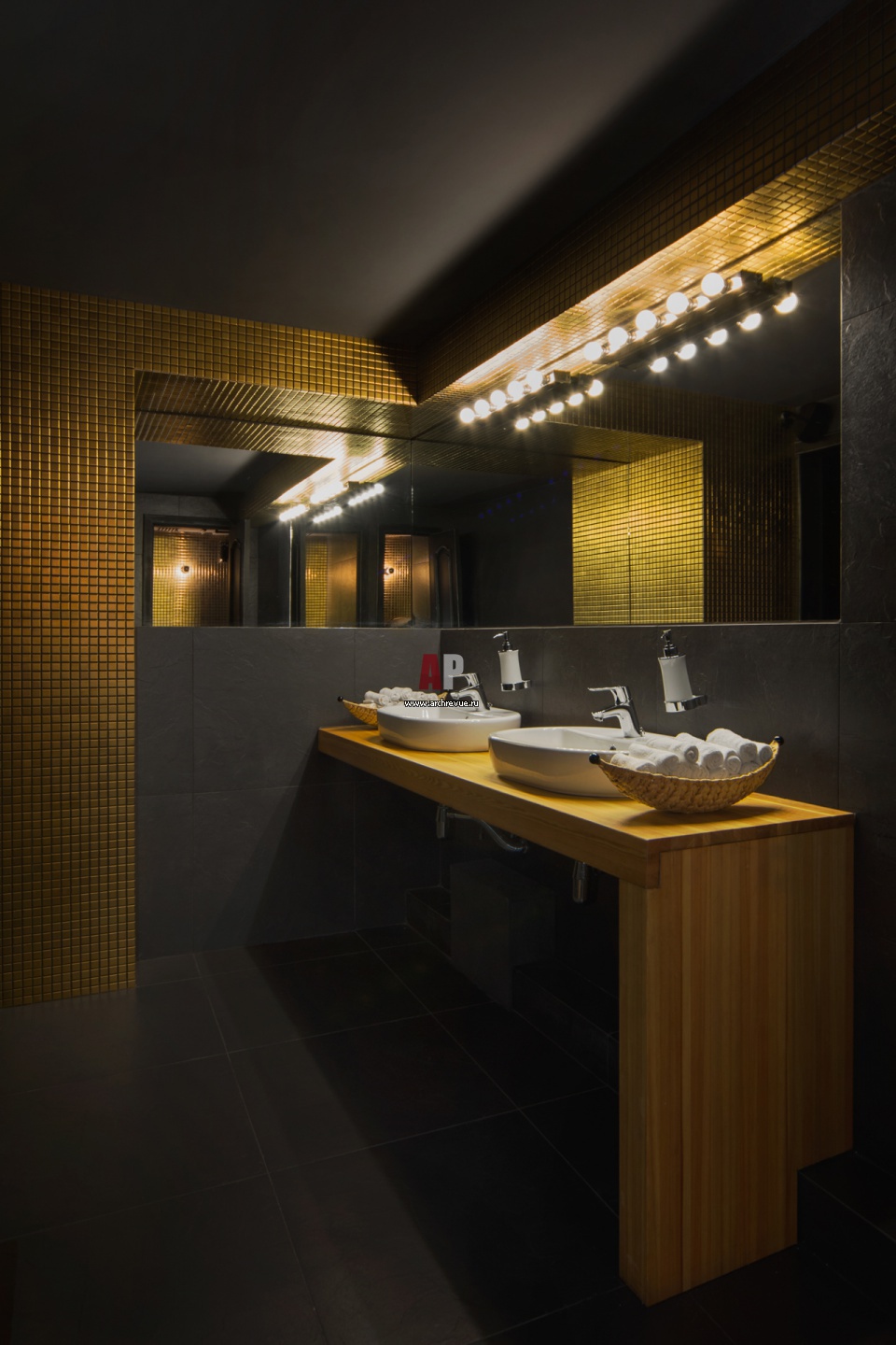Туалетные комнаты решены в темной цветовой гамме с приглушенным светом. Часть стен оформлена черной плиткой с фактурой сланца, другая – золотой мозаикой. Консоль для раковин выполнена из американского ореха.