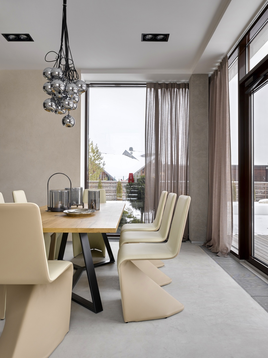 Из столовой организован выход на открытую площадку у дома с патио. Наливные полы, Flowcrete.