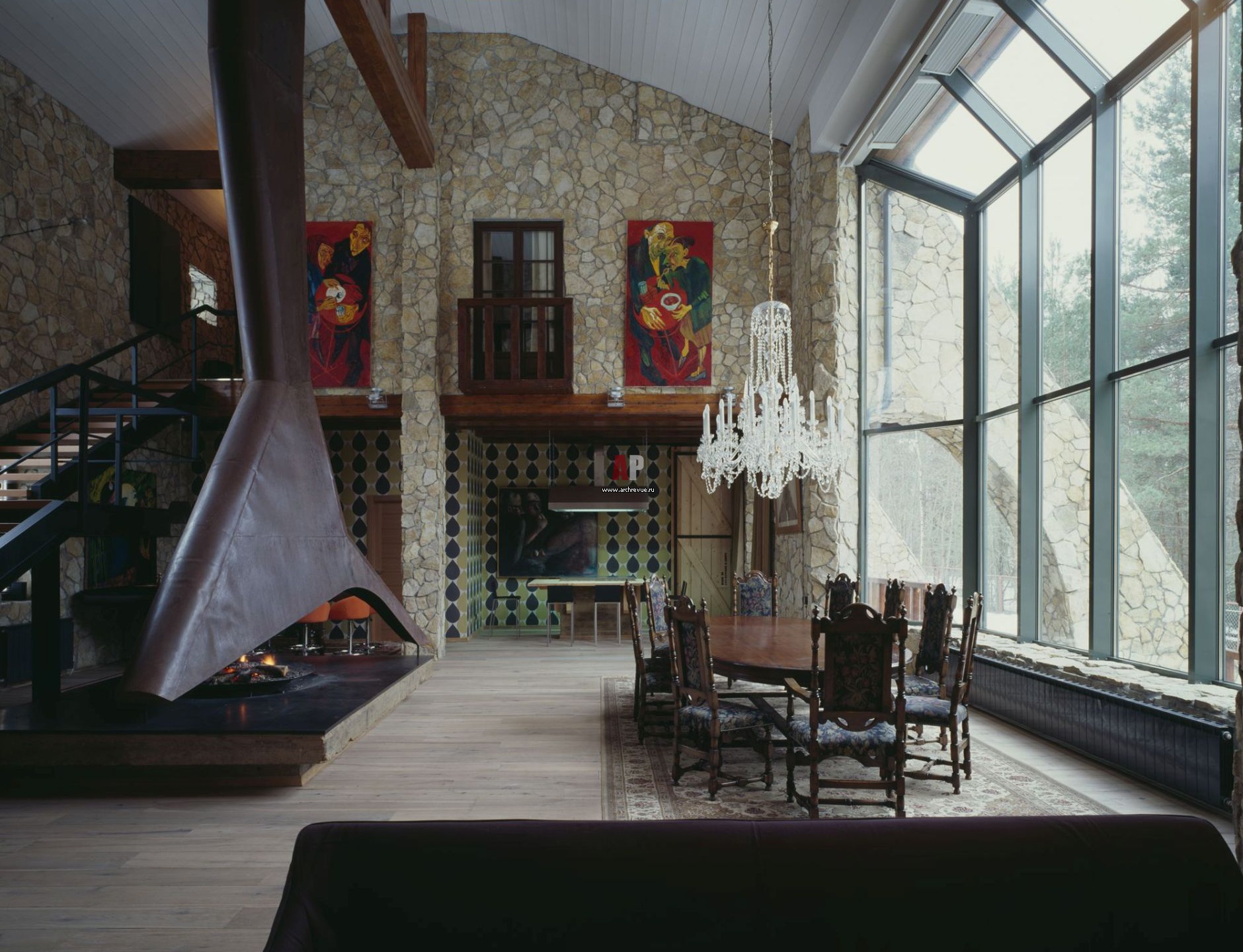 Размер камина сомасштабен немалой площади помещения. Подстолье каминной топки сделано из бетона, кожух – из проржавленного железа. Чтобы добиться красивого рыжевато-коричневого цвета, металл лежал на открытом воздухе несколько недель.