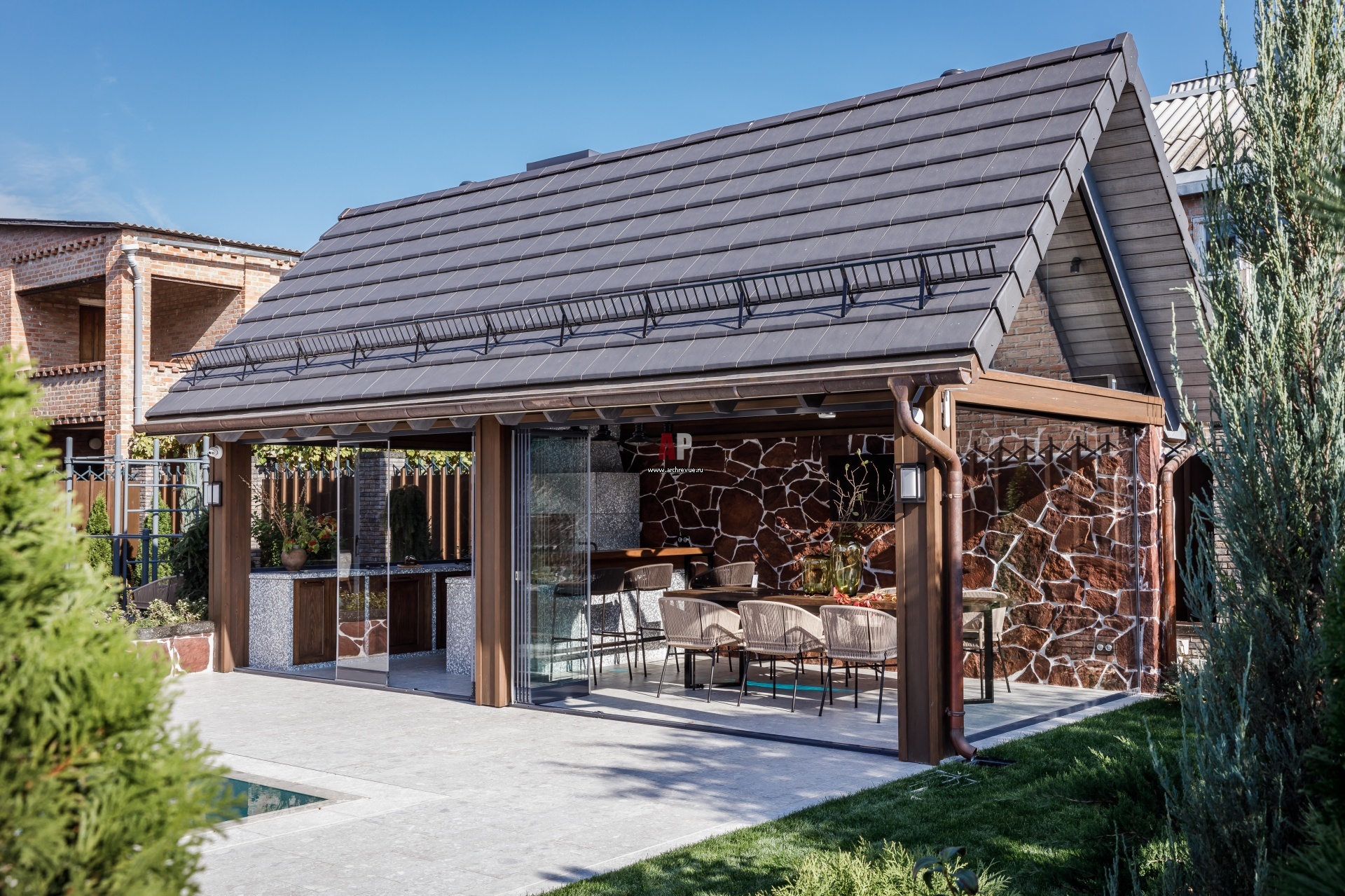 Возле дома построена беседка с летней кухней, здесь есть мангал барбекю и большая обеденная зона.