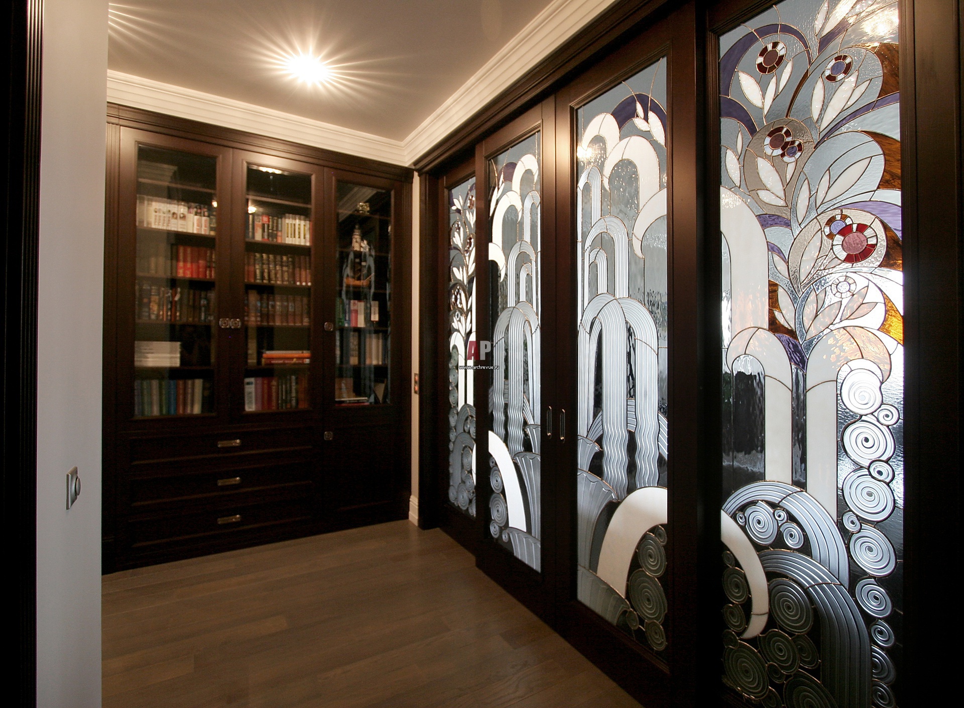 Витражные панели по эскизам, изготовление «Александрия». Библиотечный стеллаж имеет модуль для хранения коллекции сабель. Деревянные изделия, «Ольха-Декор».