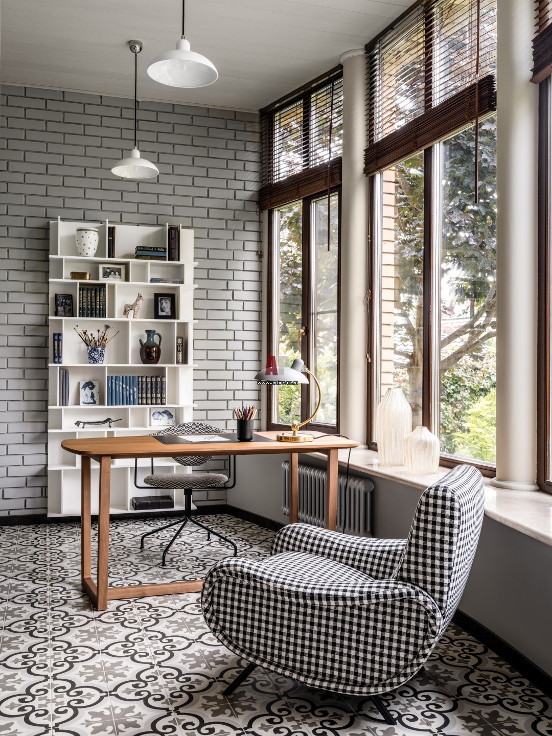 Лоджия-мастерская хозяйки дома. На полу – большие листы керамогранита с графичным рисунком. Полки, BoConcept. Стол, Poliform. Кресло, Cassina, модель Lady. Лампа настольная, Fritz Hansen.