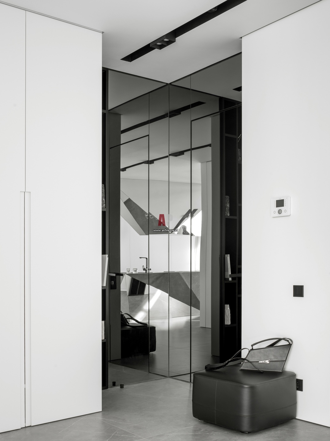 Семейная квартира с активной геометрией и монохромом. Прихожая. Шкаф, по эскизам авторов проекта, изготовление «АФ Ника».