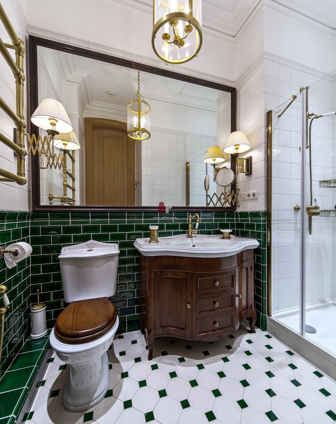 Интерьер гостевого санузла с темным деревом и бело-зеленой керамической плиткой. Сантехника, Devon & Devon.