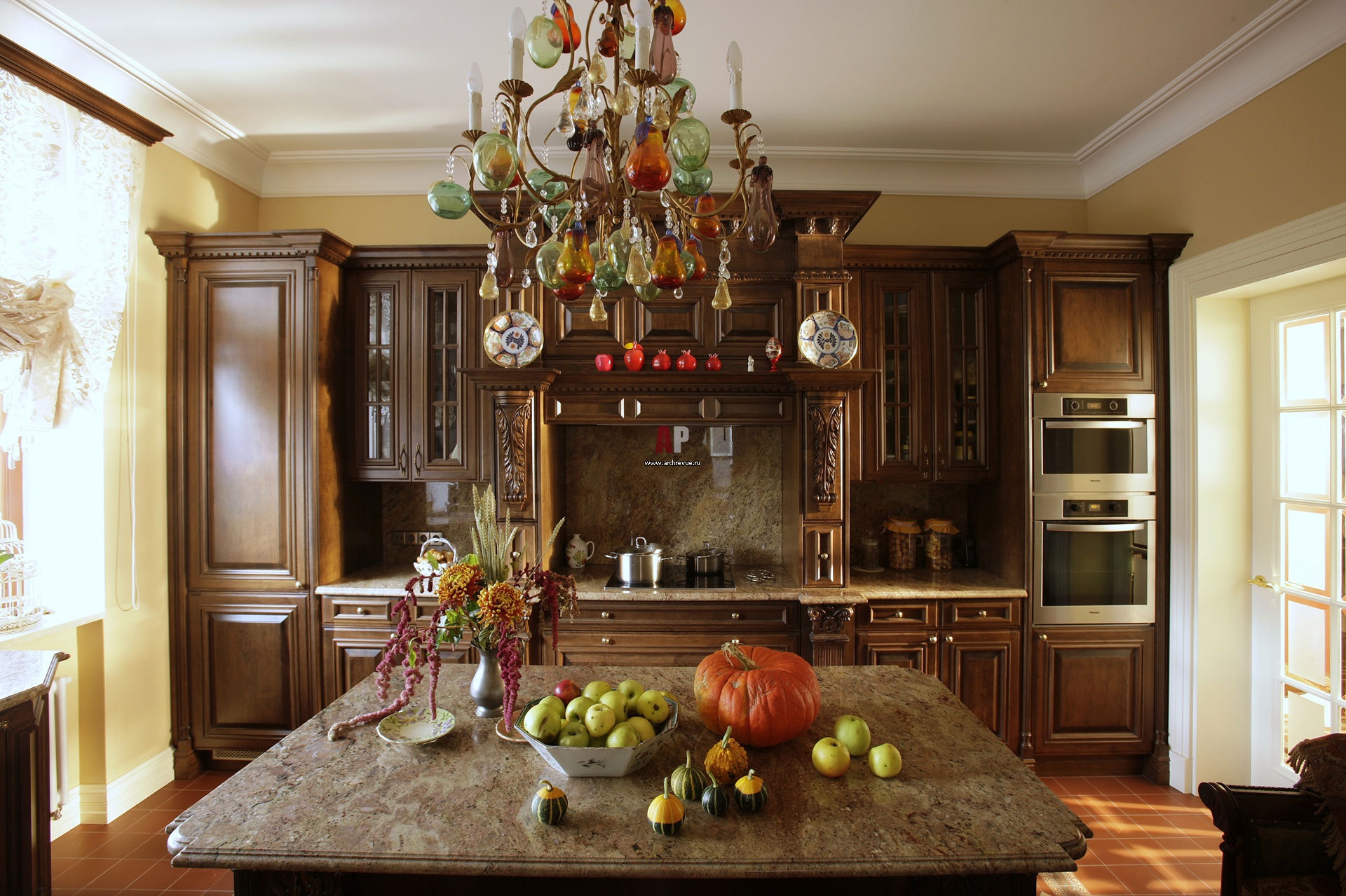 Интерьер кухни. Кухонный гарнитур из темного дуба. Островная кухня со столешницей из мрамора. Люстра из цветного стекла Tredici Design в виде фруктов.