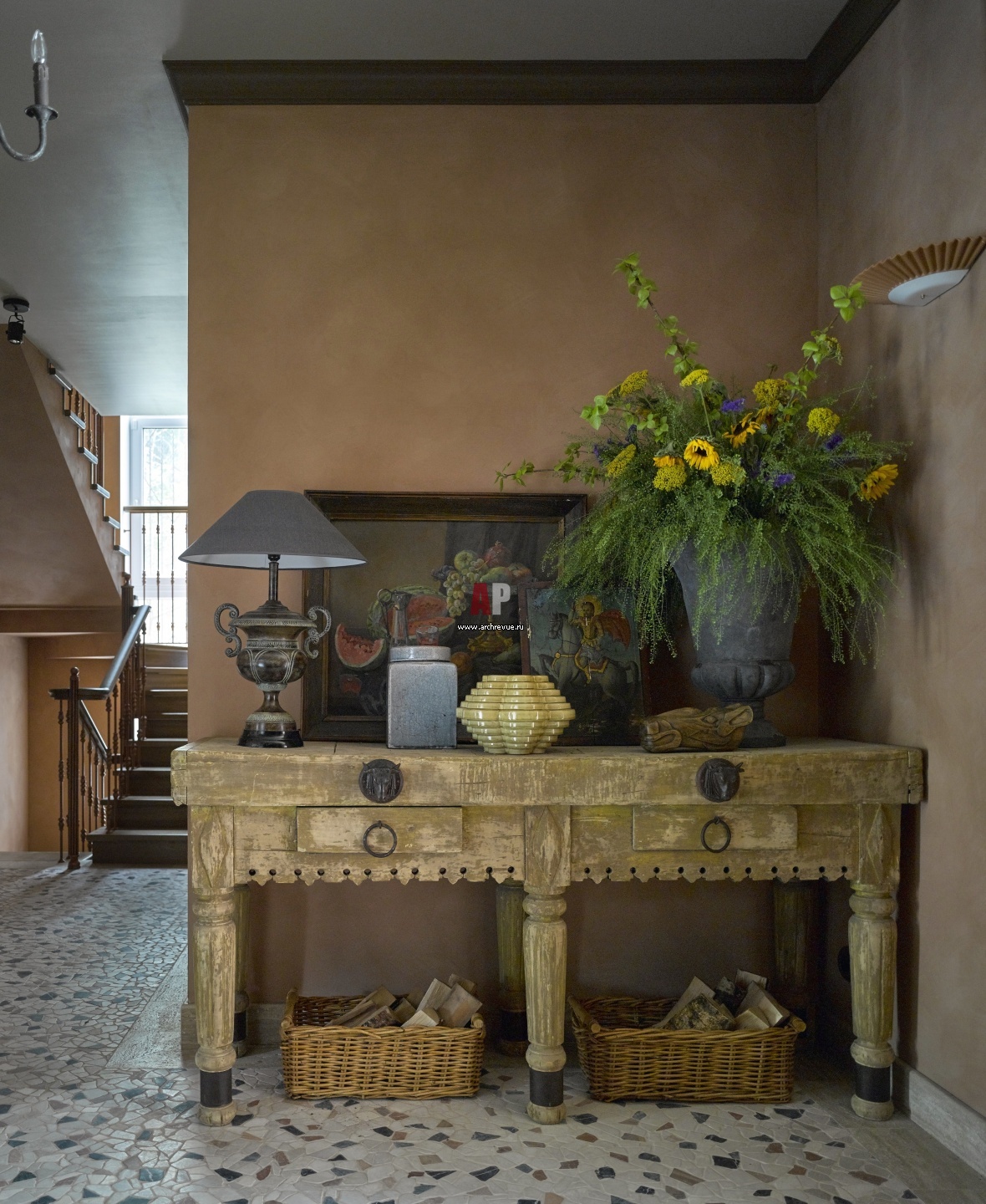 Интерьер прихожей в теплой охристо-терракотовой гамме. Консоль с эффектом старения. На полу – каменная мозаика.