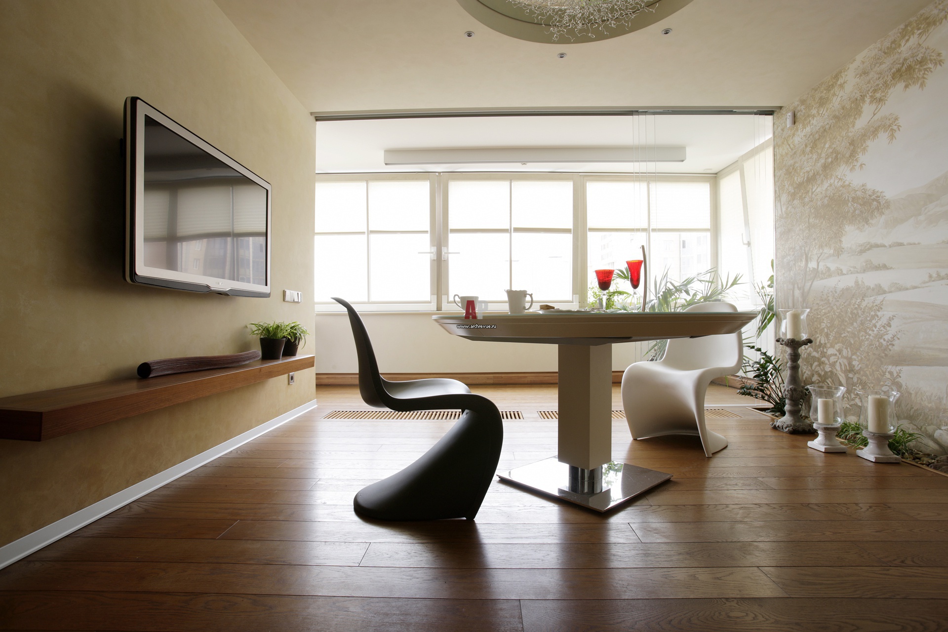 Столовая в интерьере кухни вынесена на подиум из темного красноватого дерева. Стена украшена монохромной росписью.