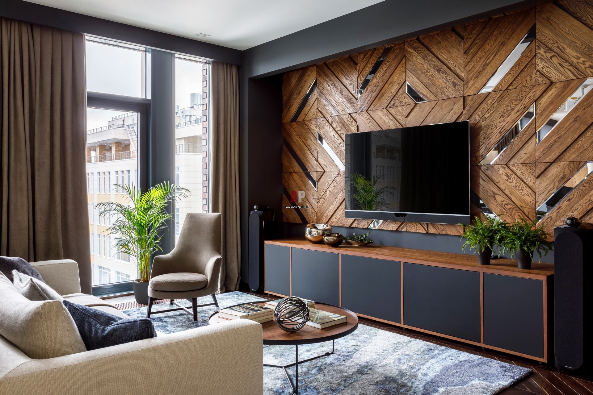 Панно за ТВ в гостиной выполнено из деревянных плашек разного размера и толщины. Чтобы оно смотрелось выразительно, дизайнер не только делала чертежи и объемные модели, но и выкладывала шаблоны из пенокартона в натуральную величину с нужными толщинам панелей и их сопряжениями, а потом украшала зеркальными вставками.