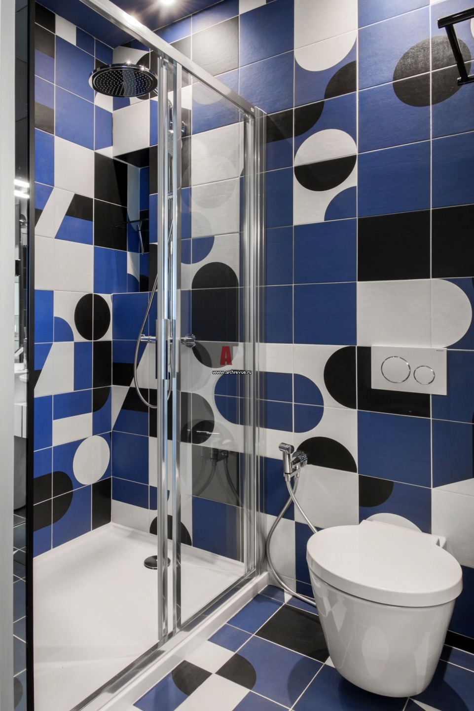 Интерьер гостевого санузла. Сантехника Philippe Starck for Duravit. Стеклянные дверки душевой, Kermi. Плитка, Mutina, коллекция Puzzle.