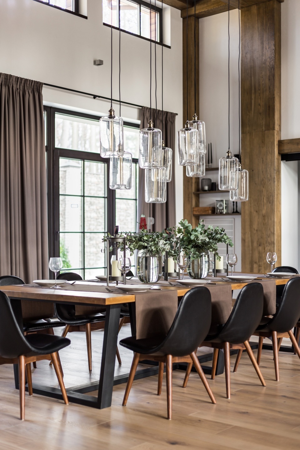 Дом в стиле современного шале для семьи с пятью детьми. На полу общей гостиной – инженерная доска спокойного натурального цвета дуба, полосы разной ширины создают необходимый ритм в огромном помещении.
