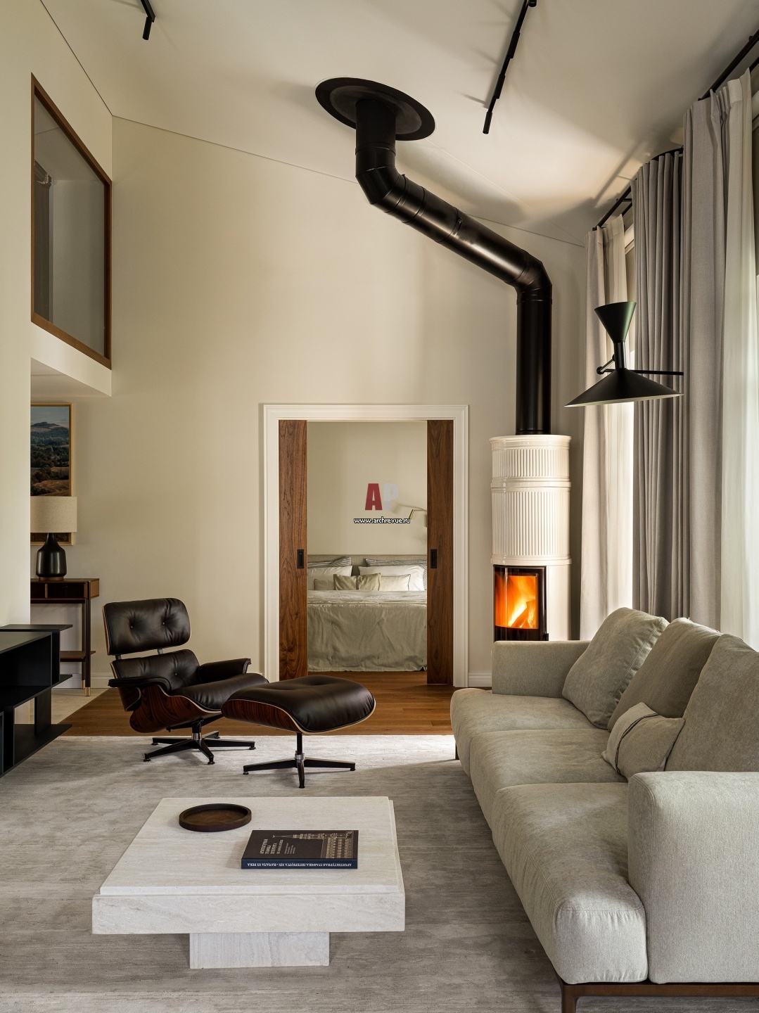 Большая высота мансардной квартиры позволила надстроить антресоль со стеклянным витражом.