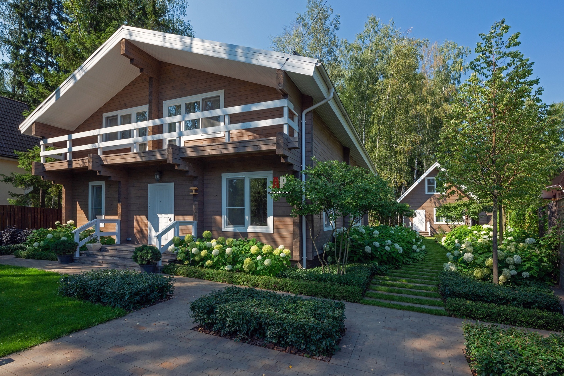 Камерный природный сад в Подмосковье. Изначально весь участок был лесным. Чтобы сделать небольшую открытую площадку с ровным красивым газоном перед домом, но при этом не вырубать взрослые растения, специалисты бережно пересадили их, распределив по периметру участка.