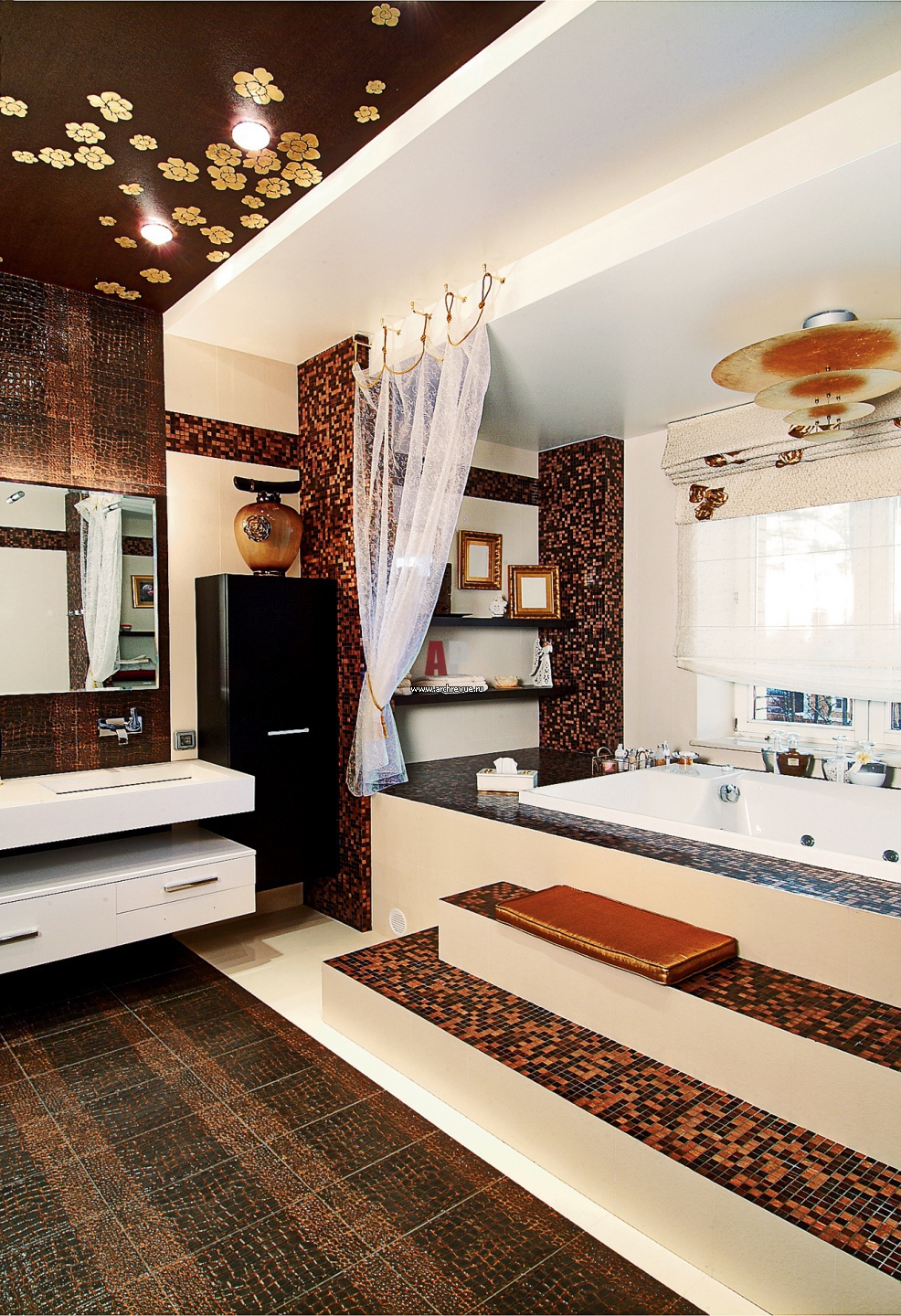 Интерьер хозяйской ванной комнаты с окном. Ванна оформлена подиумом, ступени облицованы мозаикой шоколадно-карамельного цвета. Пол выложен плиткой с фактурой кожи рептилии, на потолке – авторская роспись золотом с флористическим мотивом.