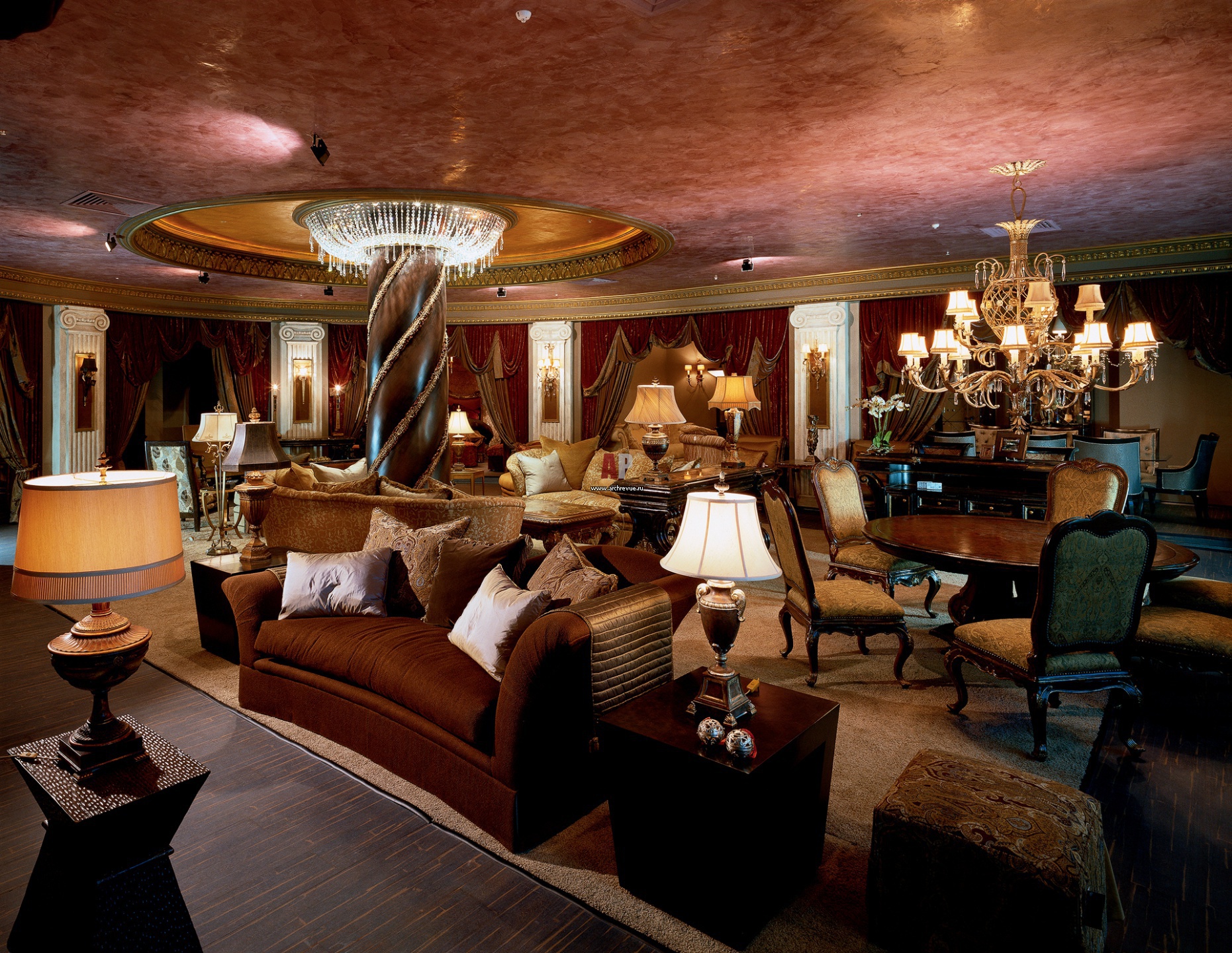 На фото – дизайн интерьера салона американской неоклассической мебели. Приглушенный свет и темные цвета создают домашнюю расслабляющую атмосферу. Потолок отделан бордовой венецианской штукатуркой и бронзовым финишем Колонну с витым орнаментом венчает круглая люстра их хрусталя, которую авторы собрали сами по хрусталику.