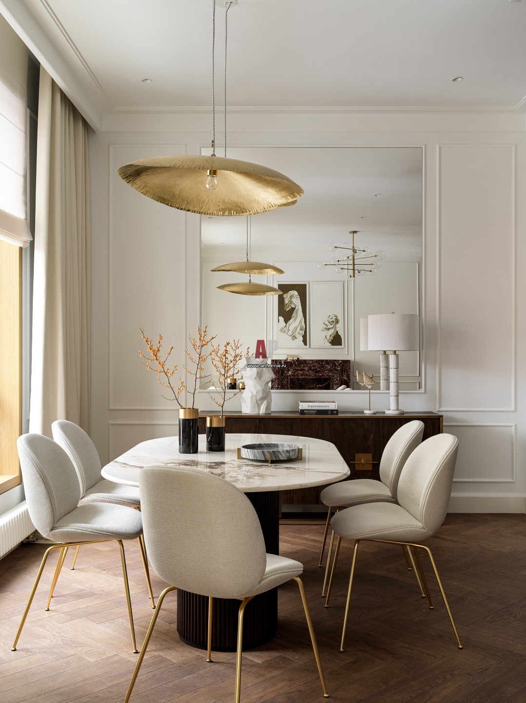 Светлая и легкая квартира в Хамовниках. Столовая зона. За обеденным столом – огромное зеркало без рамы. Оно расширяет помещение и за счет отражений делает его светлее. Подвесные светильники над обеденным столом, Gervasoni.