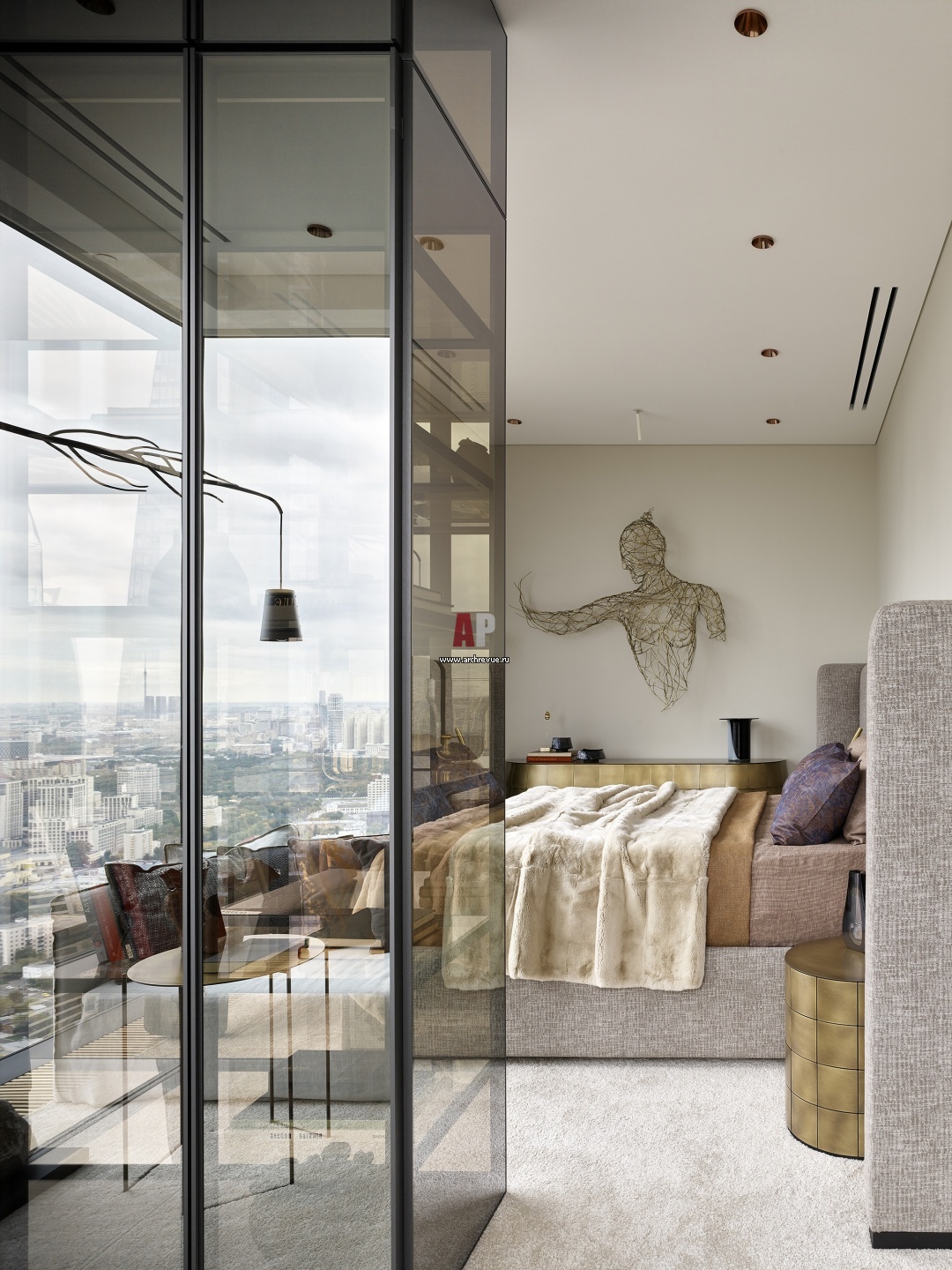 Хозяйская спальня. Кровать, Porada. На стене – объемное панно с женской фигурой. «Изначально именно это изображение было на нашем трехмерном эскизе просто в качестве примера арт-объекта на стене. Эскиз настолько понравился заказчице, что она попросила выполнить панно один-в-один. После длительных и безуспешных поисков мастера, который согласится бы взяться за эту работу, мы сделали все сами: распечатали трехмерное изображение в размере 1:1, выполнили его из латуни и смонтировали на стене», - рассказывает Валерия Маслова.