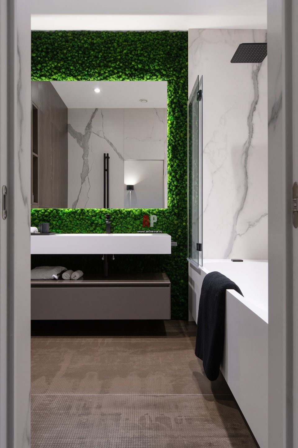 На полу гостевой ванной использован керамогранит Laminam с текстурой ржавого металла. На стенах – керамогранит Rex с имитацией мрамора. Ярким акцентом служит зеленая стена из стабилизированного мха за зеркалом.