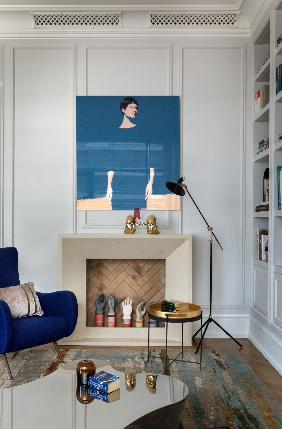 Зона отдыха с фальш-камином. Кресло, винтаж, Италия, 1960-е гг. Кофейный столик, Zuiver. Торшер у камина, Dutchbone, винтаж.