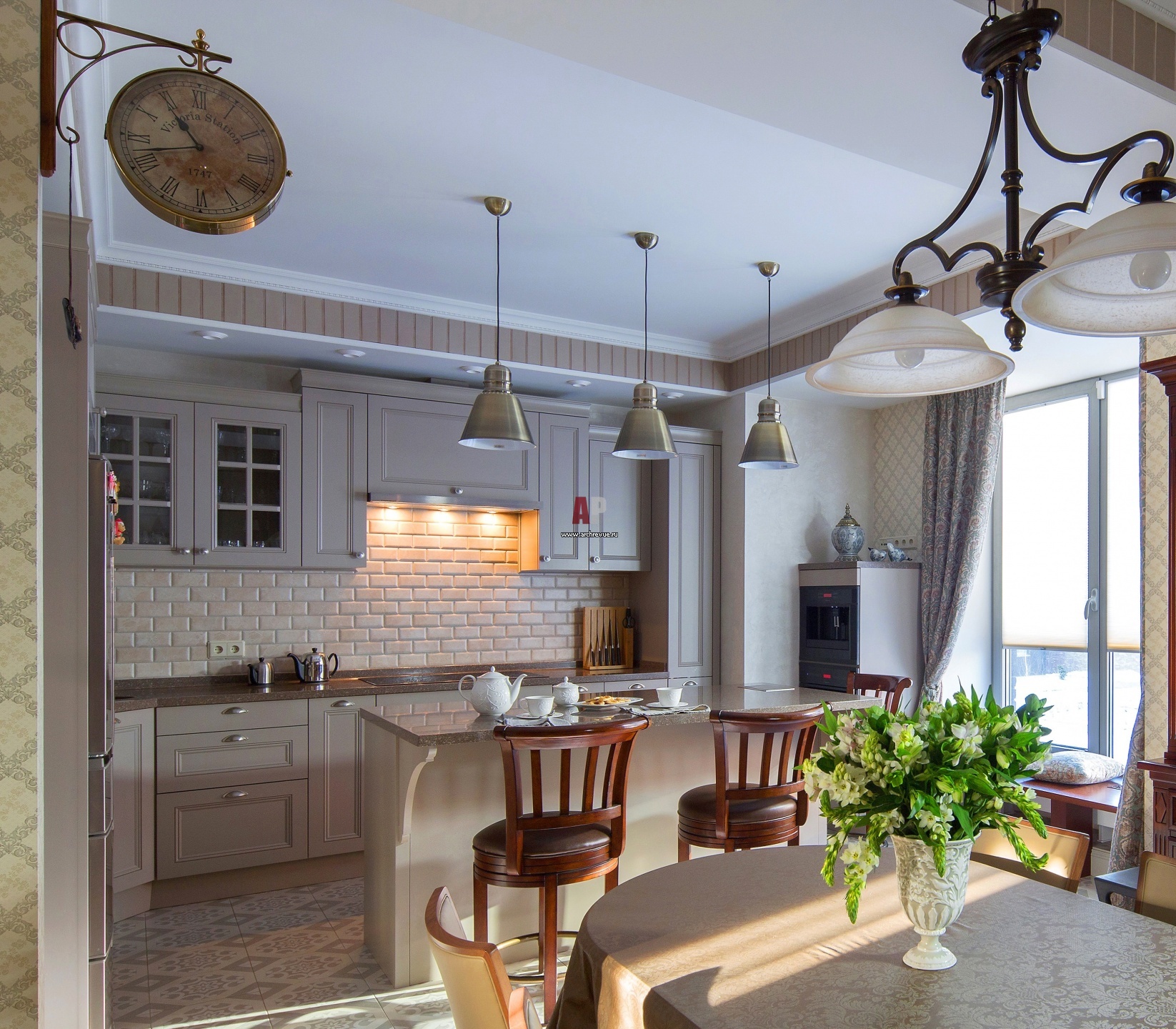 Стены кухни-гостиной оформлены клинкером Feldhaus Klinker, цвет tortora. На полу – керамическая плитка, Porcelanosa. Кухонный гарнитур в классическом стиле, Beeck Kuchen.