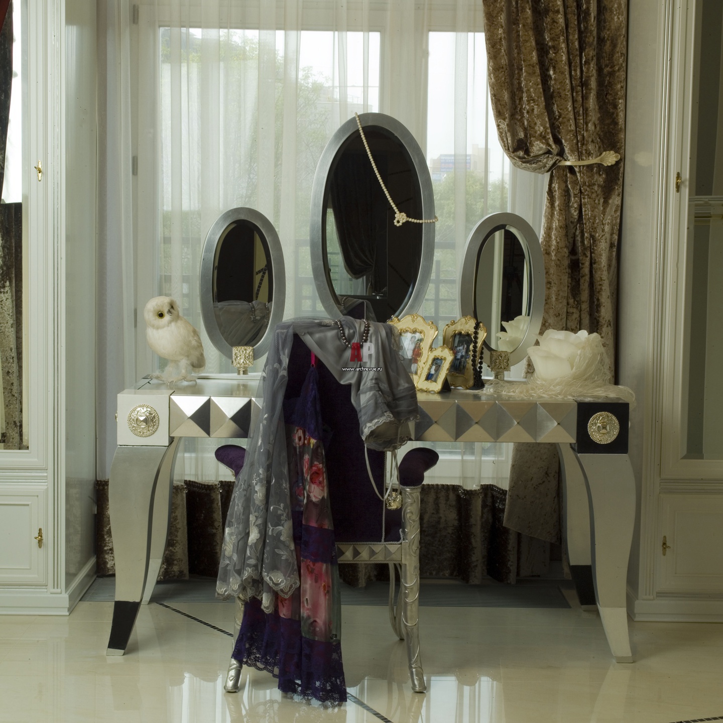 Тонкая мозаичная лента (Sicis, Bisazza) поставщик «АРДО», вьющаяся по молочному мрамору под ногами, перетекает в узор раздвижных дверей спальни, гардеробной и санузла.