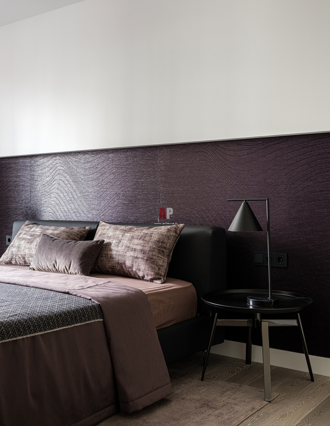 Мужская спальня. Стена за изголовьем кровати оформлена обоями с фактурой кожи, Tiffany Design.