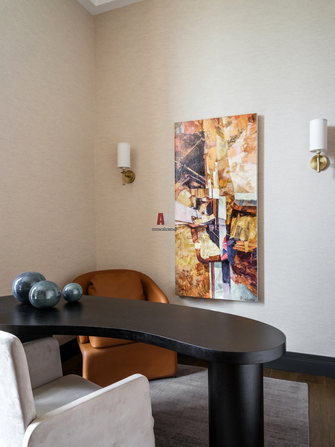 Интерьер таунхауса с нейтральной палитрой и современным искусством. Кабинет.