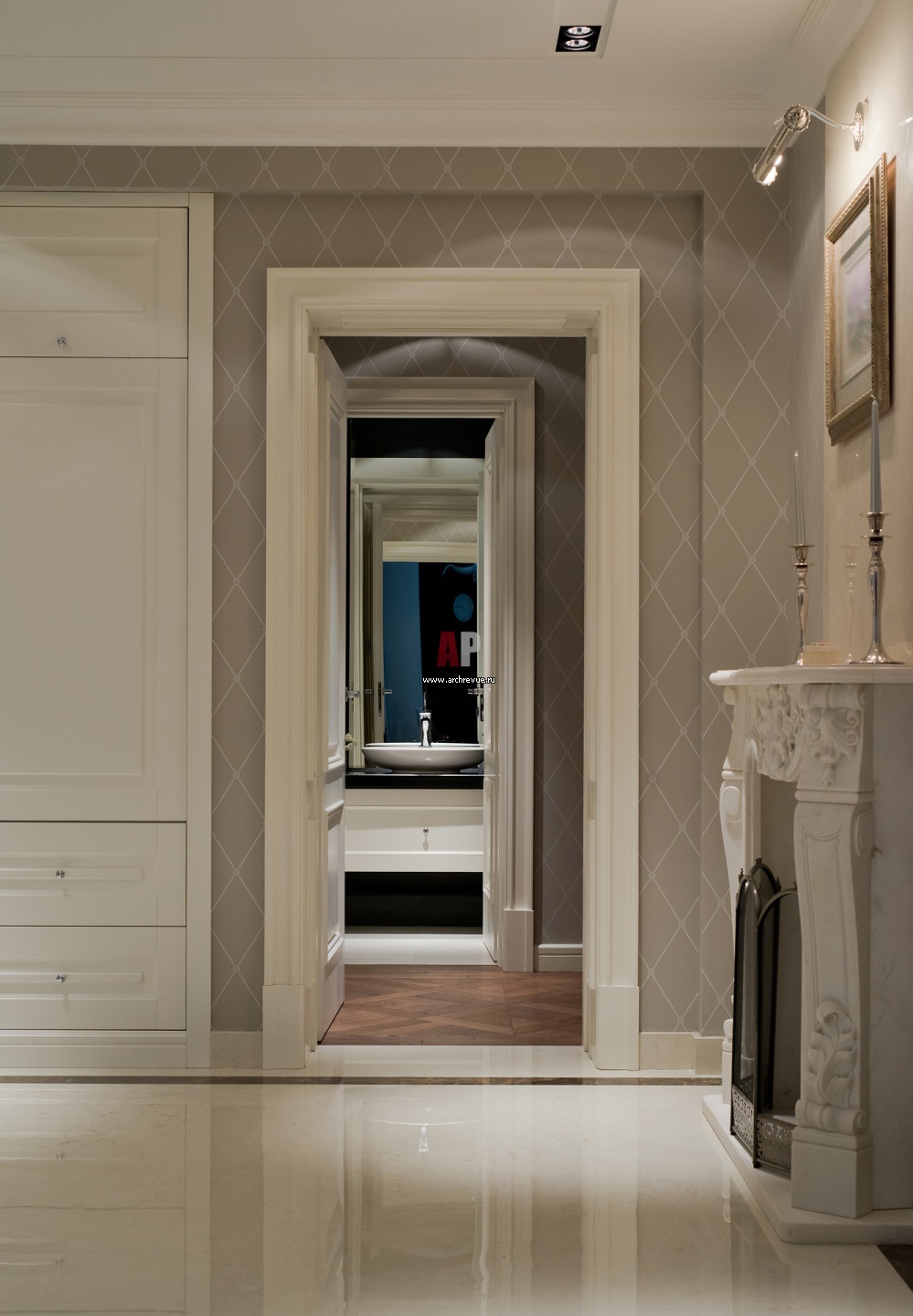 Фальш-камин в холле. Портал камина выполнен из резного белого мрамора в классической манере. Топка украшена кованой решеткой.