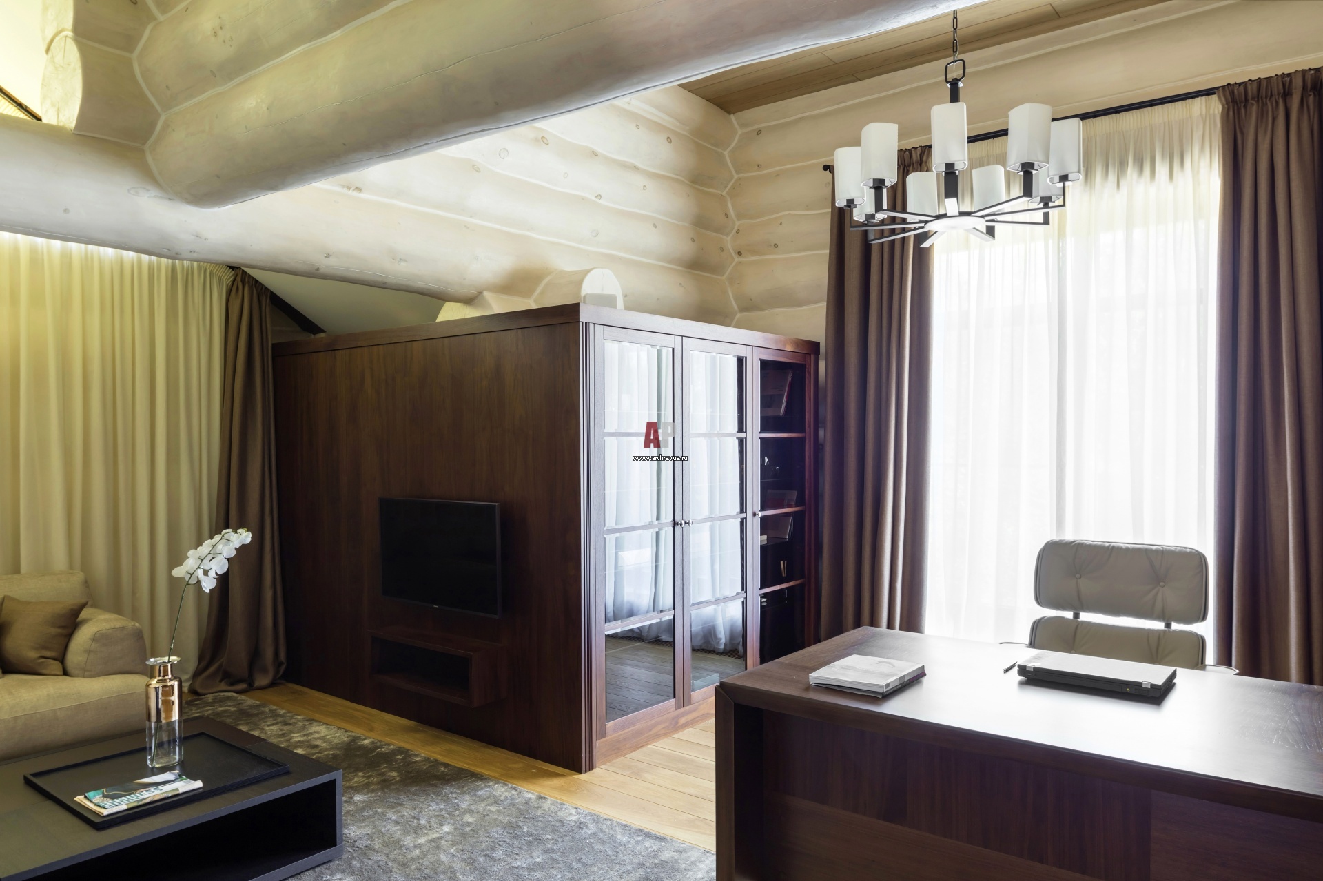 Интерьер кабинета. Первый этаж дома – монолитный, две верхних сложены из оцилиндрованного бревна алтайского кедра. Выбеленное дерево придает легкость и воздушность. Диван, Poliform. Кресло, Vitra.