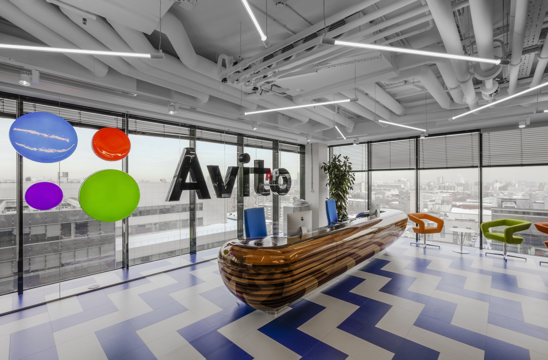 Интерьер офиса Avito в БЦ «Белые Сады». Стойка ресепшен обтекаемой формы напоминает деталь отделки роскошной частной яхты. Рисунок напольной ПВХ-плитки ассоциируется с морскими волнами.