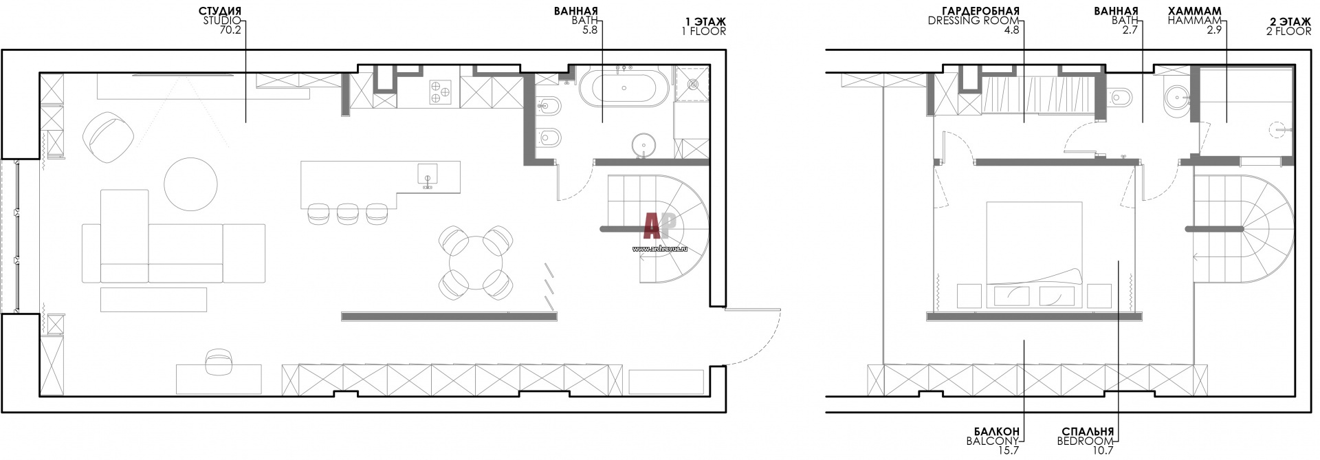 Планировка 1 и 2 этажей 2-х этажной квартиры-студии, 113 кв. м.
