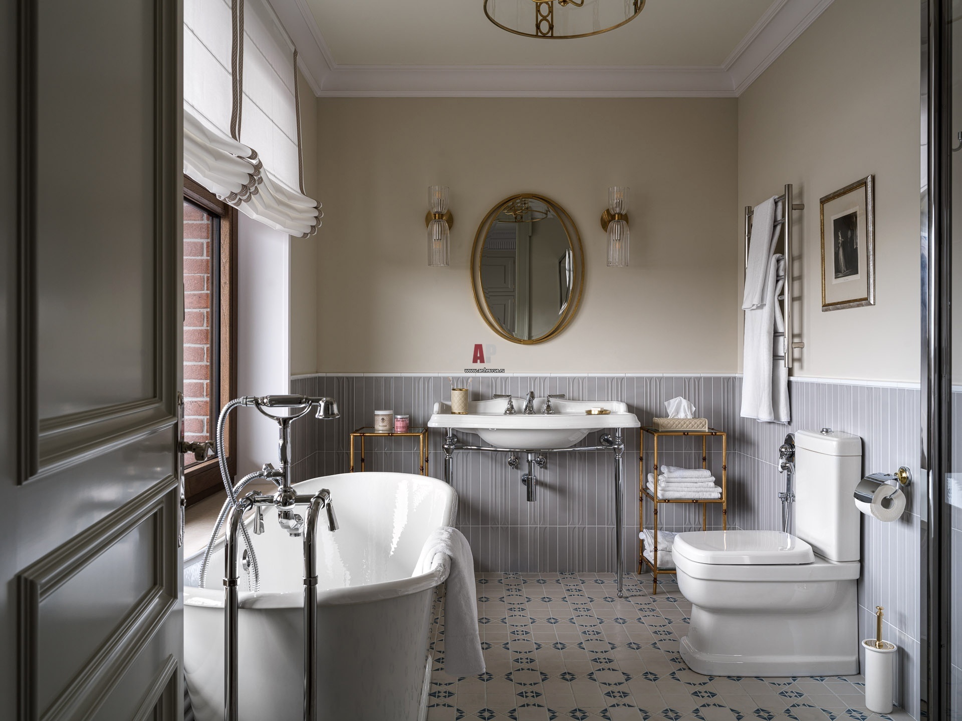Ванная комната с окном оформлена в духе английской неоклассики. Светлая палитра придает пространству еще более изысканный вид. На полу – метлахская плитка.