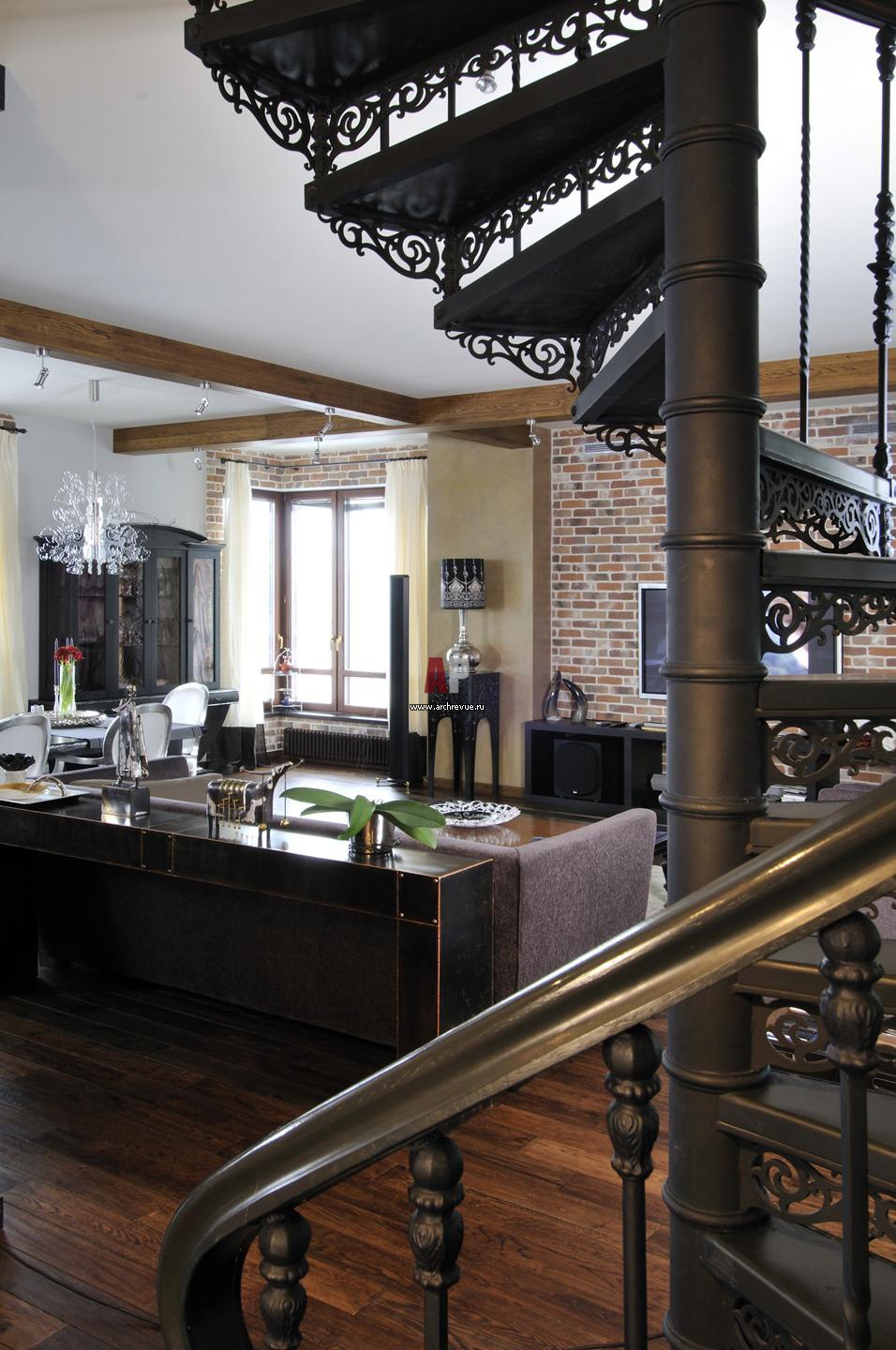 Одним из значимых элементов интерьера общей зоны становится кованая лестница, выполненная по эскизам автора. Чертежи и разработка компания «Раскада»