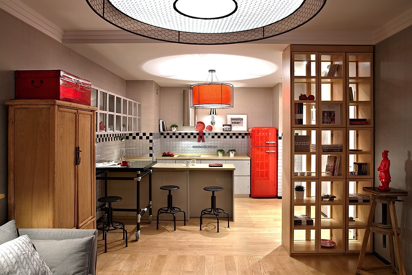 На фоне нейтральной кухонной мебели выделяется ярко-красный холодильник, Smeg. Он перекликается по цвету со светильниками, красными чемоданами и китайской статуэткой.