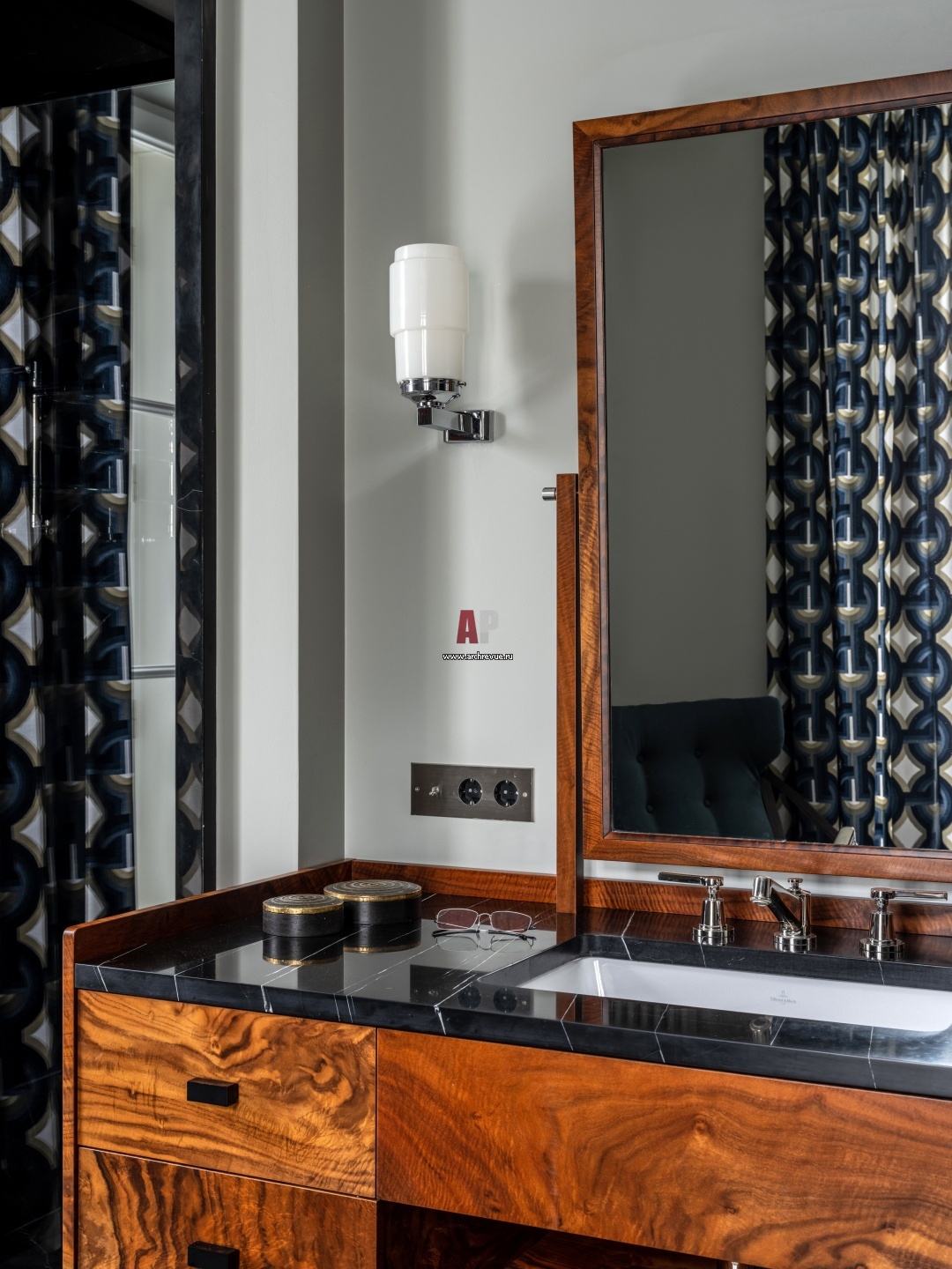 Мужская ванная комната. Умывальник из корня клена сделан на заказ. Раковина, Villeroy & Boch.