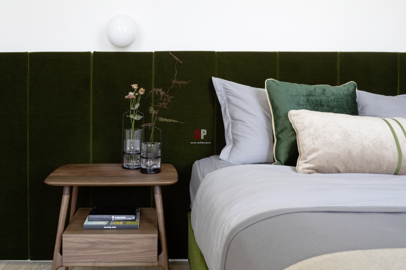 Хозяйская спальня. Стены окрашены в белый цвет. Кровать с контрастным темным тканевым изголовьем выполнена на заказ.