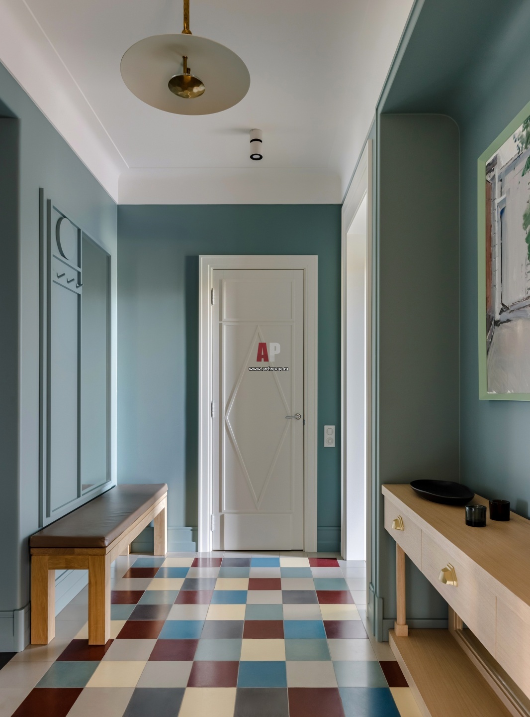 Отсылка к старым интерьерам – цементная плитка разных цветов в прихожей. Шкаф, настенная панель, консоль, по эскизам дизайнера. Скамья, Ethnicraft. Потолочный светильник, Ralph Lauren.